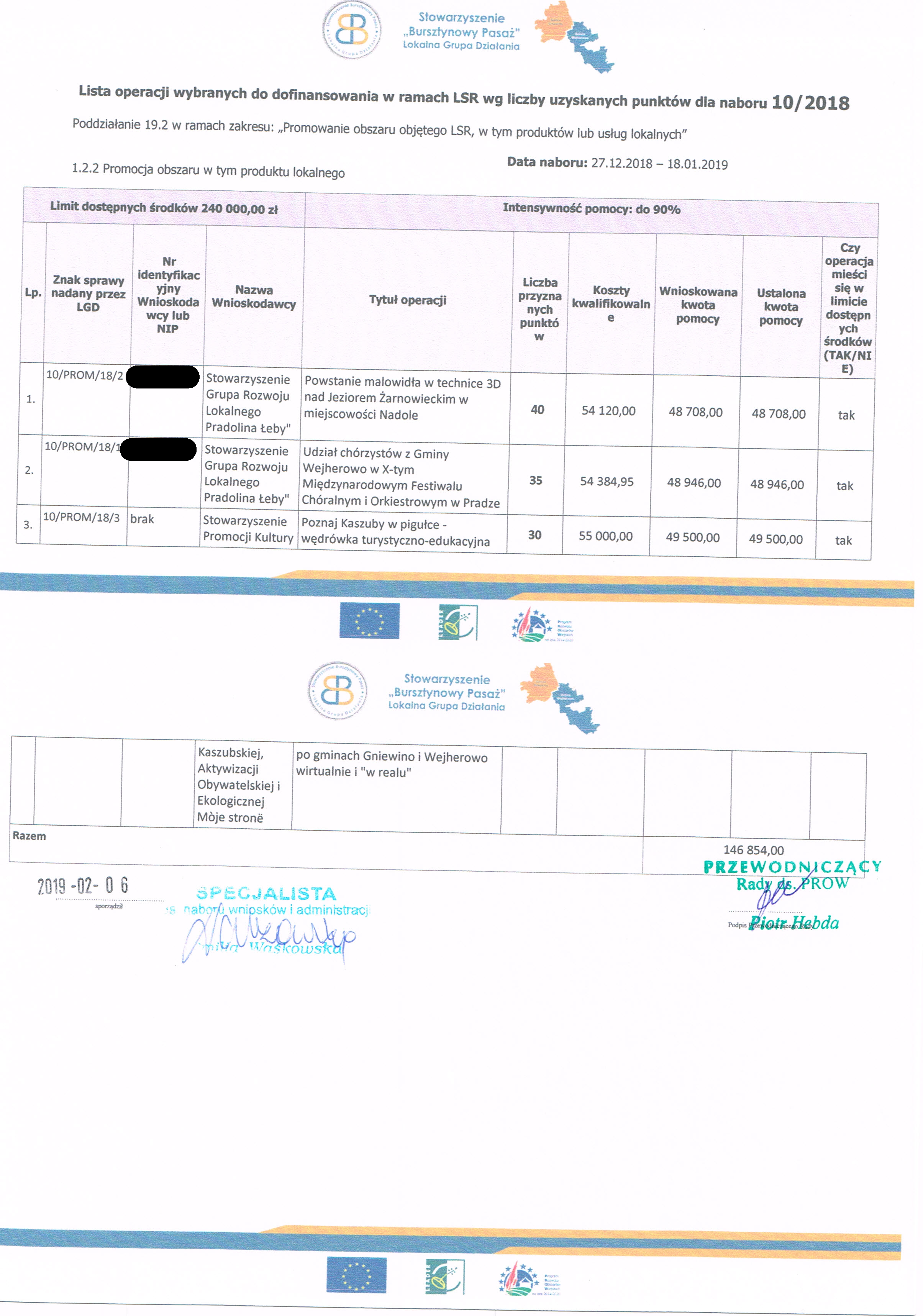 Biuro Stowarzyszenia Bursztynowy Pasaż informuje, że w odpowiedzi na nabór wniosków o przyznanie pomocy nr 10/2018, 11/2018, 12/2018 i 13/2018 w ramach działania Wsparcie na wdrażanie operacji w ramach strategii rozwoju lokalnego kierowanego przez społeczność” objętego PROW 2014 – 2020 wpłynęło łącznie 8 wniosków.